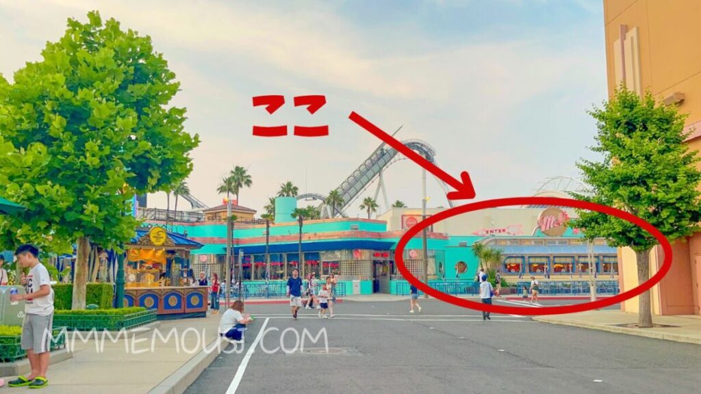 ステージ22はホラーナイト期間中は「ファクトリー・オブ・フィアー ~絶望のゾンビ・ツアー~」というホラーメイズを開催中ですので目印にすると見つけやすいと思います。