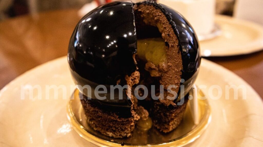 ツヤツヤ見た目からはチョコでコーティングされていて固いのかと想像しましたが、ナイフを入れてみるとすごく柔らかくてびっくりしました。